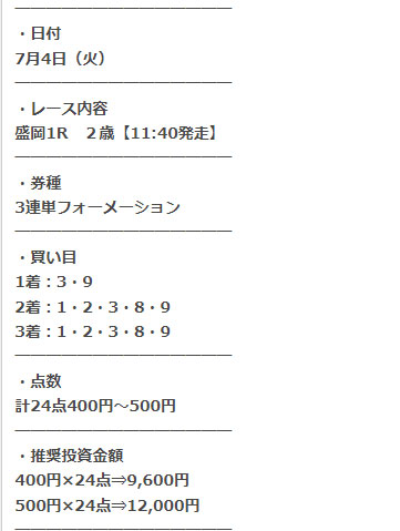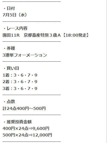 三連単のフォーメーションの予想で、馬券代は1点400円か500円の予想になっています。