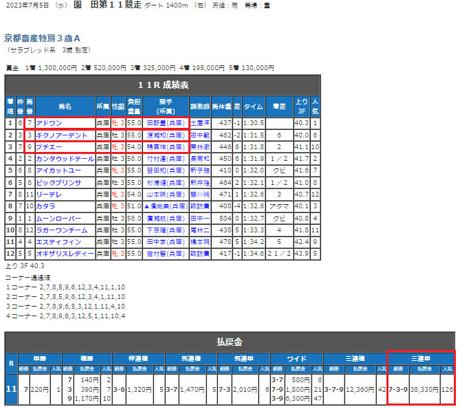 1番人気の⑦アドワンは順当に勝利し、10番人気の⑧ブチエーが3着に来てくれて美味しい配当を的中することができてよかったです。イケメン鴨宮騎手ナイスです!