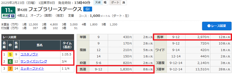 ⑨-⑫で馬連的中!仮に馬単で買っていても的中で5万9400円!
